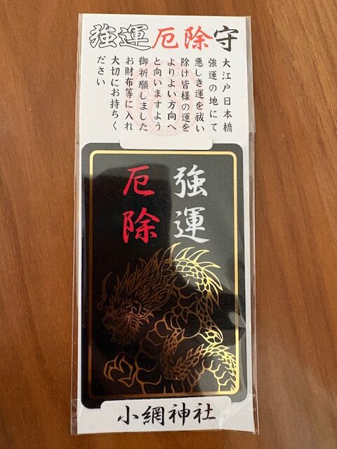 もうひとつが強運厄除けのカード守り。小網神社のカード守りは財布やスマホケースにそのまま入れられる薄型のお守りで、日常的に持ち歩くのにとても便利だ。龍が描かれたそのデザインは、拝殿の昇り龍・降り龍を彷彿とさせる凛々しさがあり、授かった瞬間から手に力が入るような気がした。